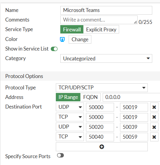 Define a new Service for Microsoft Teams with Audio/Video Ports
